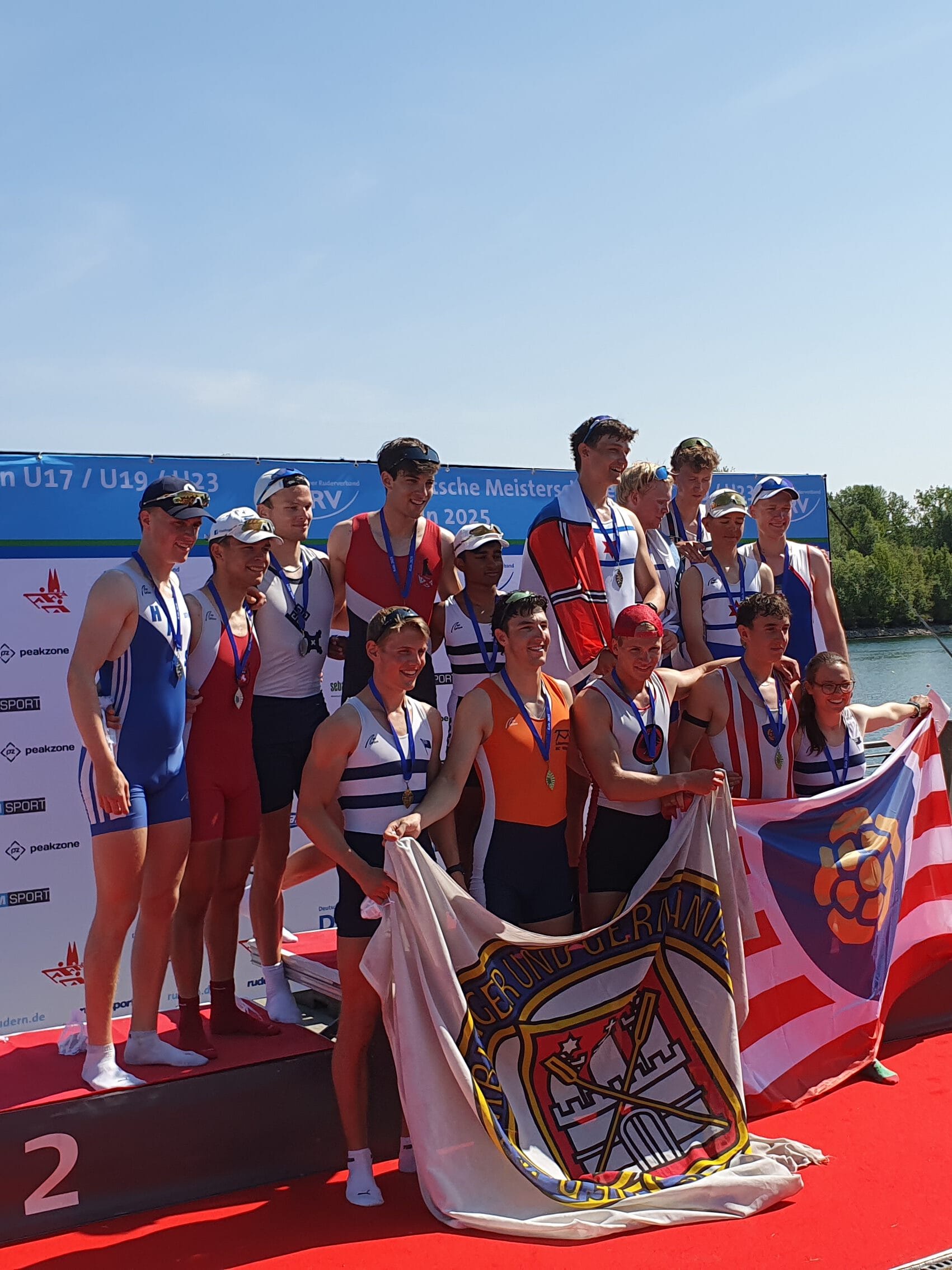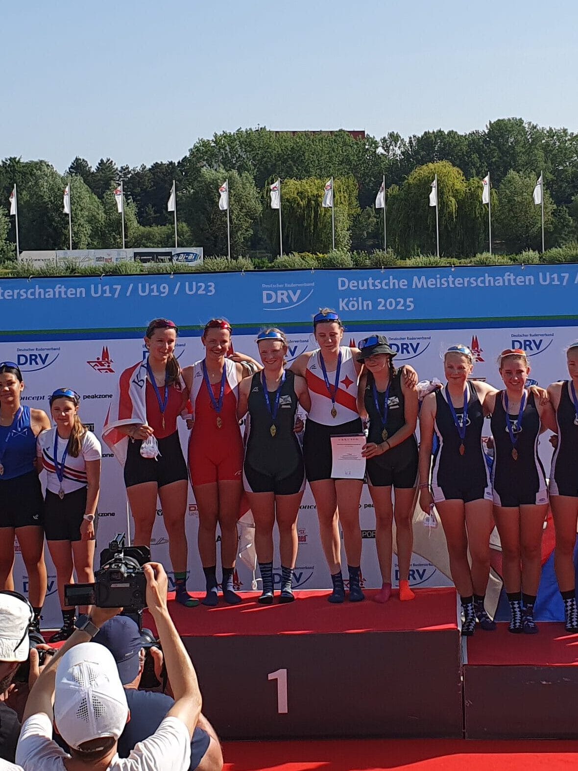 Am Sonntag folgten die Rennen von Jule Lettau im U17-Bereich. Im Vierer mit Steuerperson ging die Mannschaft nach einem souveränen Vorlaufsieg als Favorit ins Finale. Bereits zu Beginn des Rennens setzte sich das Boot deutlich ab und konnte den Vorsprung im weiteren Verlauf kontinuierlich ausbauen. Nach einem starken Endspurt fuhr das Team einen klaren Start-Ziel-Sieg ein – der Meistertitel war verdient. Im Achter fehlte am Nachmittag etwas die Durchschlagskraft; das Team belegte im engen Feld Rang vier.